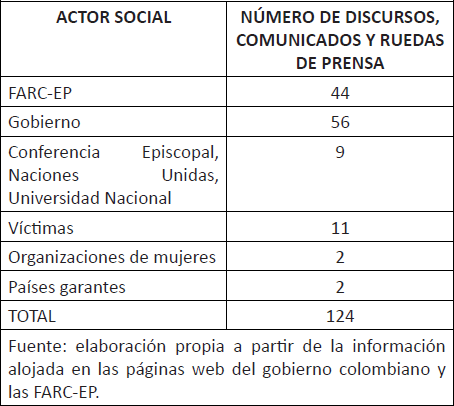 Realicé la lectura sistemática de los comunicados producidos por cada una de las delegaciones de paz (Gobierno y FARC-EP) y por otros actores que pasaron por la mesa de conversaciones entre el 18 de octubre del 2012 y el 24 de noviembre de 2016, así como de los discursos públicos que ambas delegaciones pronunciaron en momentos significativos del proceso de paz: la instalación de la mesa, presentación de acuerdos parciales, declaraciones en momentos de crisis, firma de la primera versión del Acuerdo final y firma del nuevo acuerdo.
