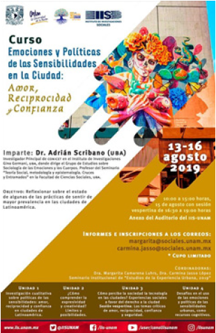 El curso será dictado por el Dr. Adrián Scribano, desde el 13 al 16 de agosto de 2019 en la Universidad Autónoma de México coordinado por la Dra. Margarita Camarena Luhrs y Dra. Carmina Jasso López. El curso será impartido de manera presencial y puede participarse también a través de YouTube.