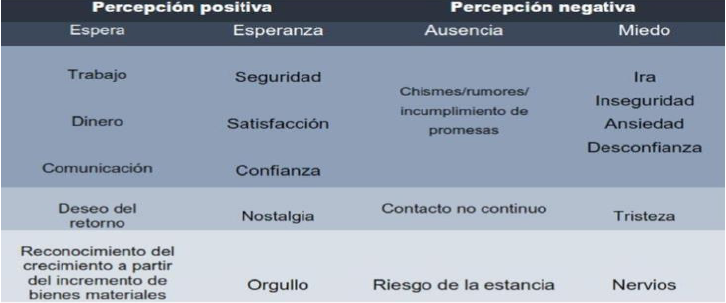 Fue posible percibir una dualidad emotiva a través de las narraciones de las entrevistadas, la mayoría de participantes juzgaban como positiva a la migración cuando la comunicación fue continua con la pareja y los ingresos constantes, hecho que significó el funcionamiento correcto del proyecto migratorio; también hubo expresiones negativas vinculadas con sensaciones de malestar que impactaban en la seguridad o la integridad moral, incredulidad, dudas sobre la fidelidad, desconfianza y recelo, entre otras.