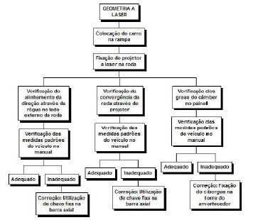 Na empresa estudada, o processo de geometria a laser acontece em três etapas. Inicialmente, o carro é colocado na rampa de geometria a laser podendo ser elevado ou não. Em seguida, o projetor a laser é fixado na roda. A primeira etapa consiste na verificação dos graus do câmber no painel de geometria (varia de acordo com o modelo do carro), não estando dentro das medidas aceitáveis realiza-se a correção através da fixação do ciborgue automotivo na torre do amortecedor. Na segunda etapa, com o projetor ainda fixado na roda a convergência, é verificada através da medição e leitura dos milímetros ou graus relativos a angulação da roda, através de um facho de raio laser que sai do projetor; esse laser é refletido em um espelho e retorna no sistema de régua do projetor fornecendo a medida. Não estando dentro dos padrões, a correção é realizada através da barra axial com uma chave fixa (de boca). A última etapa é o alinhamento da direção, o projetor ainda fixado na roda dianteira é virado em 180 graus direcionando os fachos de laser em uma régua que é fixada do lado externo nas rodas traseiras. Feita a verificação e detectando-se alguma inconformidade nos padrões (em milímetros) a correção é realizada através da barra axial com uma chave fixa (de boca).
