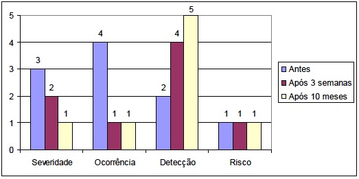 De acordo com a Figura 2, inicialmente, o índice de severidade foi considerado moderado, pois as falhas afetavam significativamente o desempenho do processo, o que gerava o descontentamento do cliente (índice 3). Após a aplicação da metodologia, esse índice passou a ser considerado pequeno, pois o cliente raramente percebia a ocorrência da falha (índice 2). Dez meses depois, verificou-se que o cliente praticamente não percebia a ocorrência da falha (índice 1). A ocorrência de falhas antes da aplicação do FMEA foi considerada alta, na proporção de 1:20 (índice 4). Após a aplicação da metodologia, a ocorrência passou a ser considerada remota, na proporção 1:50 (índice 1), mantendo o mesmo índice após os dez meses de utilização das metodologias FMEA e GUT. Antes da aplicação da metodologia, o critério de detecção foi considerado grande, pois certamente o cliente conseguiu detectar a falha (índice 2). Após a aplicação, a detecção passou a ser pequena, já que o cliente provavelmente não detectarou nenhuma falha (índice 4). Na última verificação, dez meses após a introdução da metodologia, a detecção passou a ser muito pequena, pois o cliente certamente não detectou a falha (índice 5). Os riscos de a situação repetir-se, antes da aplicação da metodologia, manteve-se o mesmo depois da aplicação da metodologia (índice 1).