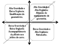 Os problemas foram priorizados de acordo com a combinação dos critérios gravidade e urgência (conforme Figura 3). Como houve a contratação de profissionais com maior nível de qualificação, após a primeira análise realizada através da metodologia FMEA, os esforços concentraram-se no acompanhamento do cliente, quando possível, nos testes do veículo após a prestação do serviço de geometria. Percebeu-se que a alta urgência verificada em relação ao retrabalho diminuiria consideravelmente se o geometrista fosse responsável pela realização dos testes no veículo após o serviço e se, além disso, o cliente estivesse presente neste momento. O principal problema elencado pela metodologia GUT foi a aferição do equipamento de geometria. Diante disso, a organização optou por agendar uma verificação quinzenal e se necessária uma aferição semanal, realizada pelo próprio operador (que recebeu treinamento).