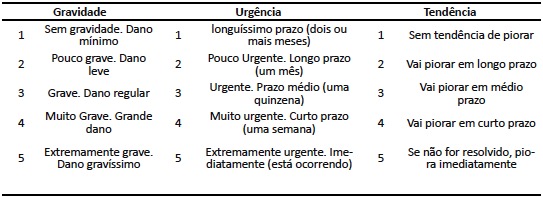 Cada problema é ponderado através de critérios numerados que vão de um a cinco, tendo como base para ponderação a Tabela 1. Após a ponderação, somam-se na horizontal os valores de cada problema e pelo total obtido eles se hierarquizam. (BEHR e ESTABEL, 2008)