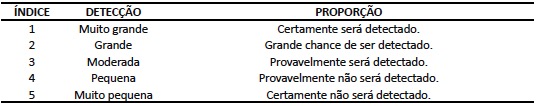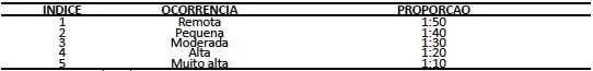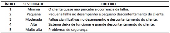 A metodologia FMEA (Análise dos modos e efeitos de falhas), pressupõe o controle dos critérios de severidade, ocorrência e detecção. Para a análise dos resultados utilizou-se os índices, o critério e as especificações de cada critério de acordo com o número representado. A severidade foi analisada de acordo com a Tabela 2, a ocorrência de acordo com a Tabela 3 e a detecção de acordo com a Tabela 4.