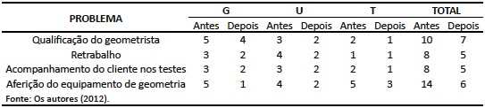 Conforme a Tabela 5 pode-se observar que a qualificação do geometrista é considerada um dano gravíssimo, com necessidade de resolução em médio prazo (no máximo quinze dias), podendo esta piorar em longo prazo caso nenhuma medida seja tomada. O retrabalho é considerado um dano grave a ser resolvido em curto prazo (uma semana), sendo que se nenhuma medida for tomada a tendência é que a ocorrência aumente. O acompanhamento dos clientes nos testes foi considerado um aspecto grave e urgente que pode piorar no longo prazo. A aferição do equipamento de geometria é considerada um dano gravíssimo, com urgência considerada de curto prazo (uma semana), sendo que a tendência é piorar imediatamente, caso nenhuma medida seja tomada. Na avaliação realizada após o intervalo de dez meses, a qualificação do geometrista passou a ser considerado um problema causador de grandes danos que deve ser solucionado no longo prazo (máximo um mês), cuja tendência é o desaparecimento. O retrabalho e o acompanhamento do cliente nos testes foram considerados causadores de danos leves e passíveis de resolução no longo prazo (um mês), com tendência ao desaparecimento. Finalmente, a aferição do equipamento de geometria com as verificações regulares, passou a ser considerado um dano mínimo a ser resolvido no longo prazo (um mês), mas com tendência a permanecer.