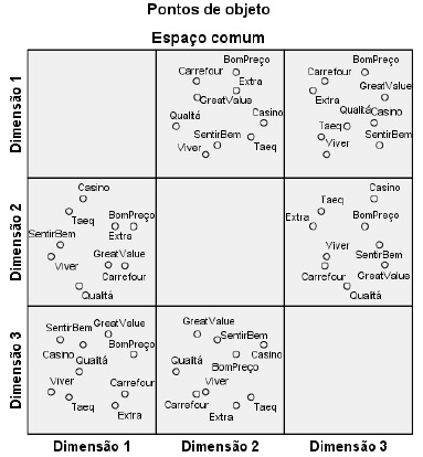 A partir da análise dos dados obtidos nos questionários, é possível construir os mapas perceptuais visando a consecução do objetivo proposto para este estudo. Foi utilizado o software SPSS para a plotagem dos mapas tridimensionais. De acordo com Hair et al. (2009, p.504), “As técnicas de escalonamento multidimensional não têm procedimentos internos para rotular as dimensões”. Logo, cabe ao pesquisador a tarefa de inferir os rótulos às dimensões encontradas, baseando-se nas características comuns encontradas entre os pontos representados e a teoria sobre o tema (MALHOTRA, 2006).