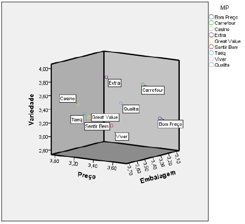Assim, é possível apresentar algumas considerações sobre a posição ocupada por cada marca própria estudada no mapa perceptual. As interpretações partem inicialmente da avaliação das dimensões objetivas (Preço, Variedade e Embalagem) para a análise global tendo em vista os diversos mapas perceptuais plotados.