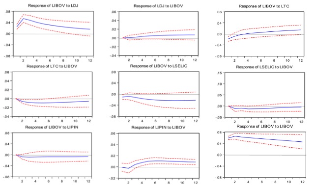 Para variações não antecipadas sobre a atividade econômica, representada pela produção industrial, a resposta do Ibovespa é negativa, porém irrelevante. Em contrapartida, choques no Ibovespa repercutem positivamente sobre a atividade econômica.