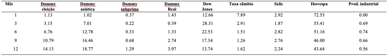 Outra ferramenta disponibilizada pela metodologia VAR é a decomposição da variância, que permite dizer que porcentagem da variância de erro de previsão decorre de cada variável endógena ao longo do horizonte de previsão, conforme pode ser visto na Tabela 9. A periodicidade das séries históricas em questão é mensal.