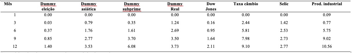 A Tabela 10 apresenta os resultados da decomposição das variâncias e a participação do Ibovespa para explicá-las. A decomposição da variância das demais variáveis, em relação à participação do Ibovespa é pequena, e em uma magnitude considerável, apenas quando se observa a produção industrial, em que apresenta sua maior influência, com cerca de 10,56% no décimo segundo mês.