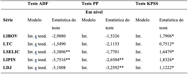 Testou-se a presença de raiz unitária empregando os testes ADF, PP e KPSS, identificando que todas as séries são estacionárias somente após a primeira diferença. Posteriormente utilizou-se o método de cointegração, conforme o método de Johansen. Foi constatada existência de relação de longo prazo através da estatística do traço e do máximo autovalor, optou-se pela existência de dois vetores de cointegração.