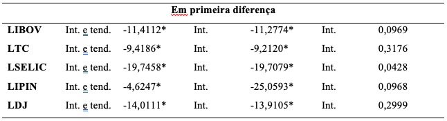 Os testes realizados em primeira diferença e seus resultados, apresentados na Tabela 2, conduzem a conclusão que para todas as séries uma única diferenciação é suficiente para torná-las estacionárias. Portanto, evidencia-se que todas as séries são integradas de ordem I (1).