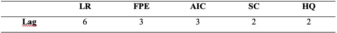 Determinado a ordem de integração das séries, realiza-se o teste de cointegração. Utilizou-se o método de Johansen, uma vez que o procedimento é baseado em um modelo VAR sendo, portanto, necessário determinar o número de defasagens (lags) a serem utilizados. Assim, visando definir o número de defasagens (p) do modelo VAR, recorreu-se aos critérios apresentados na Tabela 3. A decisão da escolha baseou-se pelo número de defasagens (p) que minimizou os Critérios de Informação Schwarz (SC) e de Hannan-Quinn (HQ). Nesse caso específico, a escolha foi por duas defasagens.