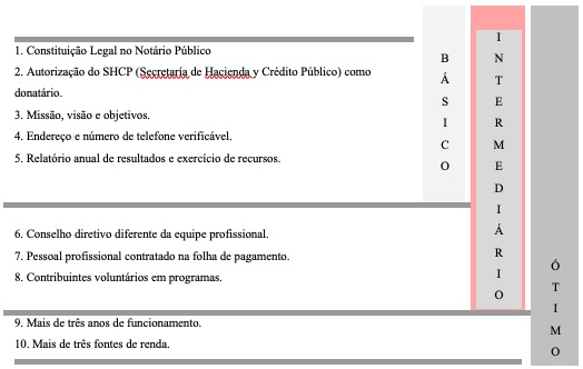 No México, além das quatro áreas estratégicas para medir o nível de responsabilidade social, o CEMEFI, como resposta à necessidade crescente que as empresas possuem de mostrar publicamente seus esforços de realizar seu trabalho profissionalmente e ser transparente na gestão dos recursos, desenvolveu indicadores de institucionalidade e transparência. Os Indicadores de Institucionalidade e Transparência são uma ferramenta de avaliação institucional, baseada em dez referências comprobatórias que refletem o nível de desenvolvimento institucional de uma organização, conforme mostrado na Figura 1.