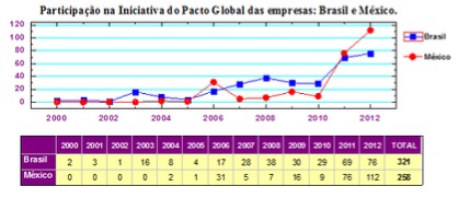 Segundo a United Nations (2010) as iniciativas que promovem a RSE, como o Pacto Mundial, tem conseguido penetrar em um número crescente de empresas na América Latina. O Pacto Global, nos 12 anos de existência vem recebendo continuas adesões pelas empresas latino-americanas e, no final de 2012, o Brasil tinha 321 empresas e o México 258 empresas que aderiram ao Pacto Global conforme mostrado na Figura 2.