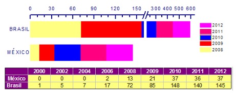 O crescimento do número de empresas que divulgam seu desempenho de RSE pode ser observado no aumento de relatórios realizados conforme o modelo GRI. De 1999 a 2012, as empresas latino-americanas apresentaram 1883 relatórios neste modelo. A aplicação do modelo GRI registra-se em especial em empresas do Brasil, Chile, Colômbia, México e Peru (AVINA, 2011). Até o ano 2012, segundo global reporting (GRI, 2013), Brasil tinha 502 empresas com relatórios de acordo aos padrões do GRI e o México 124. O número de empresas que divulgam seus relatórios de sustentabilidade nos dois países foi aumentando, principalmente observa-se esse aumento nos últimos quatro anos, conforme é mostrado na Figura 3.