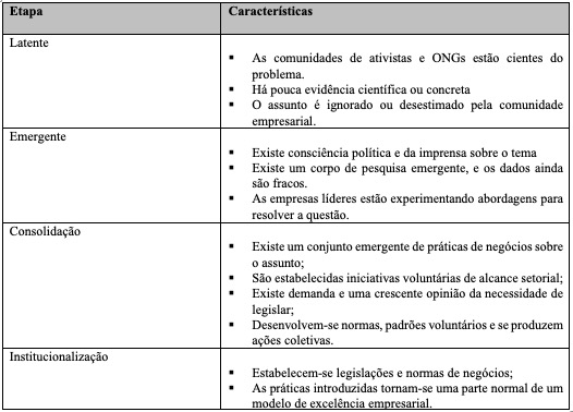 Segundo a tipologia proposta por Zadek, a evolução de um tema na sociedade atravessa quatro estágios: 1) latente: quando o tema preocupa os ativistas e as organizações não governamentais, mas não conta com evidências científicas confiáveis e a comunidade de negócios o ignora; 2) emergente: existe certa consciência política e midiática ao redor do tema, há um corpus de investigação incipiente e com dados ainda frágeis e os líderes dos negócios começam a lidar com o tema; 3) em consolidação: em que há um corpus emergente de práticas de negócios em torno do tema, surgem iniciativas e padrões voluntários com alcance setorial, cresce a idéia da necessidade de uma legislação, desenvolvem-se normas, padrões voluntários e se produzem ações coletivas; 4) institucionalizado: quando há legislação e normas de negócios estabelecidas e as práticas se tornam parte de um modelo de excelência do negócio.