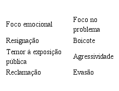 Na literatura do comportamento do consumidor, no que diz respeito à abordagem das reações comportamentais, debate-se a existência de duas correntes básicas e de uma terceira (dual approach) resultante da fusão das primeiras. A primeira corrente contextualiza as estratégias das reações como sendo emoções de natureza focada no problema (problem-focused), em que o indivíduo tende a tentar controlar o ambiente como forma de reduzir o estresse. Exemplos de respostas típicas de foco no problema seriam o distanciamento, a evasão, o afastamento do confronto e o autocontrole. Já a segunda corrente considera as respostas como sendo focadas essencialmente na emoção (emotional-focused), ou seja, como reações a estímulos do ambiente (LAZARUS, 1991). As estratégias de respostas de foco emocional buscam administrar situações estressantes provenientes de uma simples emoção negativa ou positiva, ou até de múltiplas emoções simultâneas (LUCE, 1998). A terceira corrente, por sua vez, sugere que os consumidores reagem frequentemente de ambas as formas simultaneamente em um mesmo episódio.