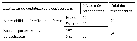 Com o intuito de verificar a importância da contabilidade e da controladoria para os hospitais pesquisados, a Tabela 3 evidencia se a contabilidade é realizada internamente ou terceirizada e se existe um departamento de controladoria.