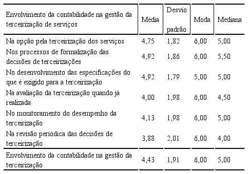 A média das respostas obtidas com relação ao envolvimento da contabilidade na gestão da terceirização de serviços foi de 4,43. Detalhando a análise, observa-se que os respondentes apontaram, na escala de sete pontos, uma média de 4,75 para o envolvimento da contabilidade na opção pela terceirização dos serviços; e uma média de 4,92 nos processos de formalização das decisões de terceirizações e no desenvolvimento das especificações do que é exigido para a terceirização. Por outro lado, identificou-se menor envolvimento da contabilidade na revisão periódica das decisões de terceirização, com uma média de 3,88 e com um desvio padrão de 2,01. A moda e a mediana apresentam valores altos em todas as alternativas apresentadas aos respondentes.