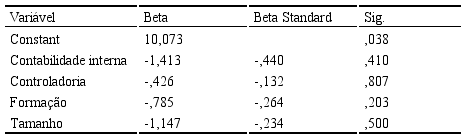Após a realização dos testes dos pressupostos, efetuou-se a regressão linear para verificar o envolvimento da contabilidade na gestão da terceirização de serviços, de forma que os fatores analisados seguiram os do estudo de Lamminmaki (2008). Na Tabela 5, encontram-se os resultados das regressões.