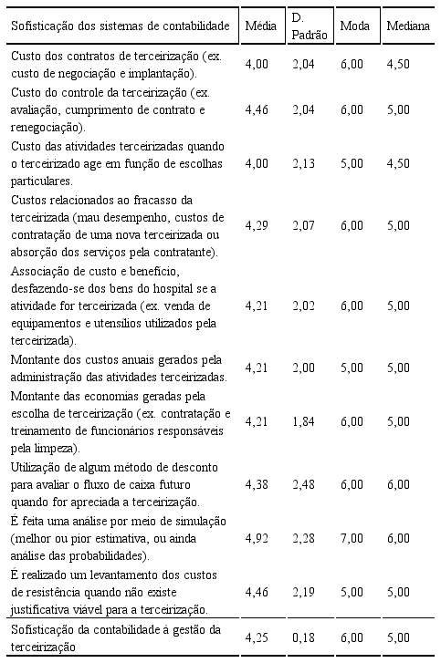 A terceira etapa desta pesquisa consistiu em verificar a sofisticação dos sistemas de contabilidade para contribuir na gestão da terceirização de serviços. Os resultados apresentados na Tabela 7 destacam a estatística descritiva das respostas obtidas na pesquisa em escala Likert de sete pontos, referente à sofisticação dos sistemas de contabilidade.