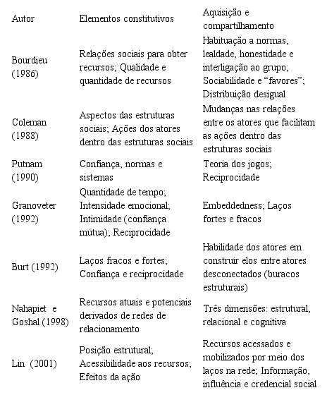 Os conceitos de capital social, bem como seus elementos constitutivos e suas formas de aquisição e compartilhamento, são apresentados resumidamente no Quadro 1 a seguir.