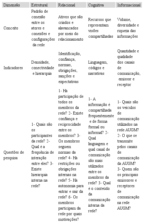 Com base no conteúdo das entrevistas e no mapa da rede gerado pelo UCINET, o capital social foi analisado em suas dimensões estrutural, relacional, cognitiva e informacional (NAHAPIET; GOSHAL, 1998; KOKA; PRESCOTT, 2002). A dimensão estrutural foi analisada conjuntamente com o mapeamento da rede AUGM por meio de ferramentas de ARS, surgindo, então, a necessidade de três indicadores para as demais dimensões do capital social: confiança e reciprocidade (dimensão relacional) e canais de comunicação (dimensão cognitiva e informacional).