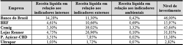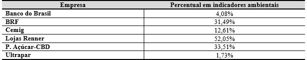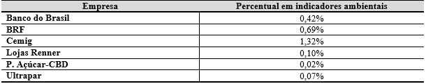 Quando analisados os indicadores ambientais, evidenciou-se que a empresa BRF teve o maior valor de investimento da receita líquida nesses indicadores e que as Lojas Renner apresentaram o menor investimento. Entretanto, em relação à receita líquida, a empresa Cemig foi a que apresentou o maior valor, ou seja, 1,32%, e a empresa P. Açúcar foi a que menos destinou sua receita líquida para esses indicadores, com 0,02%.