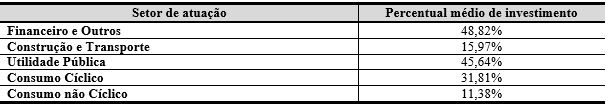 Novamente, os resultados deste estudo se aproximam dos achados de Dal Magro et al. (2012) em relação à empresa P. Açúcar, visto que essa empresa evidenciou um percentual de 11,05% de investimento no ano de 2010, índice próximo dos 11,38% verificados neste estudo. Para analisar o percentual de investimento das empresas, considerando o setor de atuação, elaborou-se a Tabela 7.