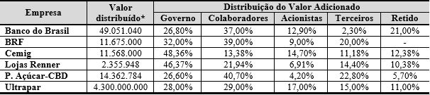 No que concerne aos colaboradores, destacam-se a P. Açúcar-CBD, com DVA de 40,70%, a BRF, com DVA de 39,00%, e o Banco do Brasil, com DVA de 37,00%. Já a empresa com menor distribuição para os colaboradores foi a Cemig, com 13,38%. A Ultrapar teve a maior distribuição em relação aos acionistas, pois apresentou o percentual de 17,00% do total do valor adicionado a distribuir. Já as empresas P. Açúcar-CBD, Lojas Renner e BRF tiveram a menor distribuição entre os acionistas, com 4,20%, 6,91% e 9,00%, respectivamente.