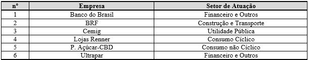 Já a amostra da pesquisa é composta de todas as empresas do programa que publicaram o Balanço Social do ano de 2013 em seus respectivos sítios. Dessa forma, constituíram a amostra deste estudo seis empresas, apresentadas, a seguir, no Quadro 2.
