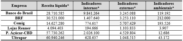 Em relação aos indicadores internos, o Banco do Brasil apresentou o maior valor (R$ 9.841.264), e as Lojas Renner novamente apresentaram o menor valor (R$ 194.666). Já em relação aos indicadores externos, a Cemig apresentou o maior valor (R$ 5.707.429), e a Ultrapar apresentou o menor (R$ 1.048.515). Por fim, no que tange aos indicadores ambientais, a BRF evidenciou o maior valor (R$ 212.000), e as Lojas Renner evidenciaram novamente o menor valor (R$ 3.907). Percebe-se, assim, que a empresa Lojas Renner, da mesma forma que apresentou menor receita líquida para esse ano, apresentou o menor valor quanto aos indicadores internos e ambientais.