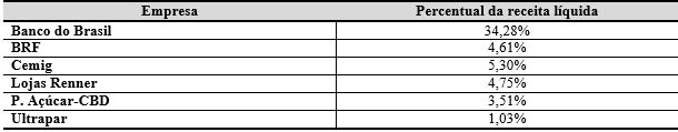 Vale salientar, ainda, que o Banco do Brasil, a BRF e o P. Açúcar apresentaram um percentual de investimento aproximado, sendo este de 11,30%, 10,66% e 7,85%, respectivamente. Nesse sentido, esse resultado se aproxima dos achados de Santos e Silva Júnior (2013), que verificaram que, em relação aos investimentos sociais externos, o Banco do Brasil investiu 6,53% de sua receita líquida no período analisado.