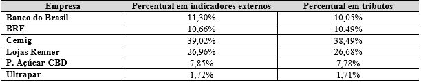 Tais resultados vão de encontro aos achados verificados por Dal Magro et al. (2012), que identificaram que o Banco do Brasil apresentou investimento de 0,03% da receita líquida em indicadores externos, enquanto que a Cemig investiu 53,87%. Destaca-se, ainda, que esses autores perceberam um investimento de 7,95% por parte da empresa P. Açúcar, um resultado muito próximo do encontrado neste estudo.