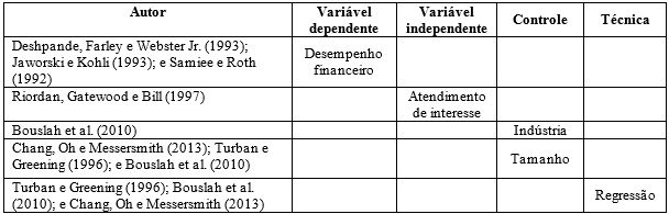 A relação entre CSP e CFP também é estudada em amostras brasileiras, sendo mensurada de diferentes formas, como no estudo de Oro et al. (2014), que encontrou relação positiva entre capital intelectual de natureza social e ambiental e desempenho econômico-financeiro, e o estudo de Crisóstomo, Freire e Vasconcellos (2011), que averiguou relação negativa entre o desempenho em responsabilidade social e a CFP.