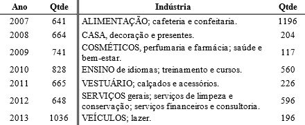 Cabe mencionar, ainda, que a utilização de dados secundários oriundos de anuários de franquias é presente nos estudos sobre redes de franquias desde a década de 90, sendo possível elencar estudos nacionais e internacionais publicados em periódicos que usaram dados secundários para analisar as franquias (Melo et al., 2015; Melo et al., 2014; Mariz-Pérez; García-Álvarez, 2009; Davidovitsch; Caldas; Ferreira-da-Silva, 2009; Elango, 2007; Shane, 1998; Martin; Justis, 1993).