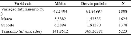 Observa-se que o ano em que se obteve maior número de resposta dos franqueados é 2013. Quanto ao setor, o que possui o maior número de respondentes na amostra total é o de alimentação, cafeteria e confeitaria. As estatísticas descritivas também foram obtidas para a variável dependente (variação do faturamento de um exercício para o outro), as variáveis independentes (as notas atribuídas ao suporte e à marca pelos franqueados) e a variável de controle métrica (tamanho). As estatísticas descritivas são apresentadas na Tabela 2.