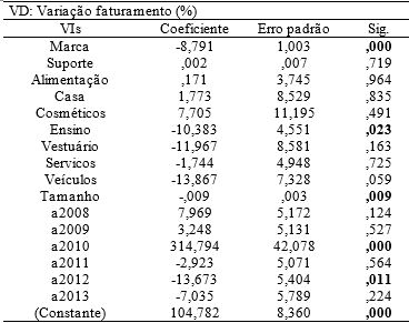 Observa-se, na Tabela 3, que a variável marca apresenta relação negativa e significante com a variação do faturamento, enquanto a variável suporte não apresenta relação estatisticamente significante. Os resultados também incluem as variáveis de controle (tamanho, dummies para setor de atuação da franquia e para o ano) e a análise de multicolinearidade, pela estatística variance inflation factor (VIF).
