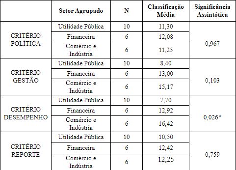 O Quadro 2, exposto a seguir, representa o resultado do teste de Kruskal Wallis para a variável setor. Atribuiu-se uma hipótese para a verificação desse teste, que discute se as respostas das empresas dependem do seu campo de atuação. Para obter o resultado, trabalhou-se com as médias das respostas com relação ao nível de significância. Os setores foram divididos em: Utilidade Pública; Financeira; e Comércio e Indústria. Atribuiu-se a fusão do grupo Comércio e Indústria ao fato de existir somente uma empresa na área de Comércio.
