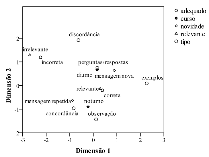 A Figura 1 mostra que a turma do período diurno possui maior proximidade com as mensagens de perguntas e respostas (caracterizadoras de debate) e mensagens novas, ao passo que a turma do período noturno possui maior proximidade com as mensagens de concordância e observação e com as mensagens repetidas. Ambas as turmas possuem distâncias similares das mensagens relevantes e corretas e ambas estão distantes das mensagens incorretas e irrelevantes.