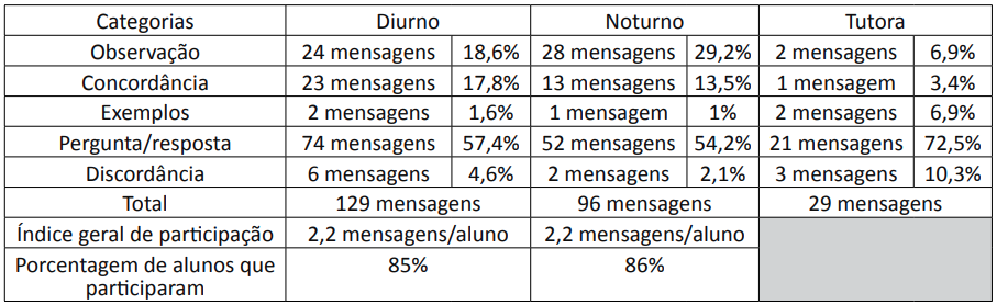 As turmas tiveram os mesmos conteúdos teóricos durantes as aulas, o mesmo atendimento da tutoria e os mesmos materiais didáticos disponibilizados; porém, observa-se diferença entre seu desempenho no fórum. Isto pode estar relacionado à própria natureza do curso noturno, no qual os estudantes, em maioria, trabalham em período integral, enquanto no curso diurno, por ser integral, os alunos possuem maior disponibilidade para dedicar-se às atividades acadêmicas. Nesse sentido, dado que a discussão no fórum é uma atividade complexa que exige leitura prévia de material, pesquisa, acompanhamento constante da discussão (BALAJI; CHAKRABARTI, 2010) e, portanto, grande dedicação de tempo, a maior disponibilidade do diurno pode explicar sua melhor participação.