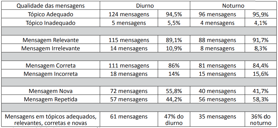 Observa-se a partir dos resultados apresentados no Quadro 3 que a maioria das mensagens foi considerada relevante para a discussão e correta ou pertinente. Entretanto, boa parte das mensagens foi repetida. Isto pode ser explicado pela obrigatoriedade de duas mensagens por aluno, notas comparativas e grande quantidade de participantes, tendo em vista que os alunos do período diurno e noturno participaram conjuntamente da discussão.