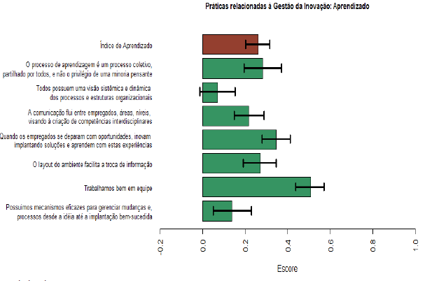 No gráfico 1 pode-se verificar que o índice aprendizagem organizacional apresenta-se, em média, significativamente positivo, uma vez que o limite inferior do intervalo de confiança não chega à zero. Este fato evidencia que os respondentes, em média, concordam que suas empresas adotam práticas que permitem aprender continuamente.