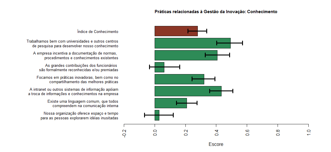 No gráfico 2 a seguir, verifica-se que o índice Conhecimento apresenta-se, em média, significativamente positivo. Assim sendo, existem evidências de que os respondentes, em média, concordam que as empresas do setor elétrico adotam posturas de criação, geração, armazenamento e compartilhamento de conhecimento em práticas relacionadas à gestão da inovação.