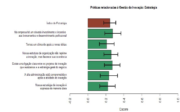 No gráfico 3, pode-se verificar que o índice estratégia apresenta-se, significativamente positivo. Os dados apontam que os participantes concordam com as práticas de gestão da inovação relacionadas à estratégia. Pode-se observar que, nesse constructo, as médias dos itens são bem semelhantes e apresentam certa linearidade.