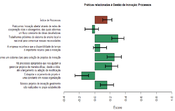 No gráfico 4, abaixo, pode-se verificar que o índice Processos, após desconsiderar o item “Extrapolar o orçamento do projeto é uma constante em nossa organização” (PR7), apresenta-se, em média, significativamente positivo; portanto, existem evidências de que os respondentes são concordantes em relação as práticas relacionadas à gestão da inovação: Processos.