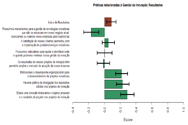 No gráfico 5, verifica-se que o índice Resultado apresenta evidências significativas, que seu valor médio é positivo; porém, como o resultado é consideravelmente próximo a zero, não há clara concordância sobre a importância dos resultados obtidos com as práticas de inovação. Além disso, destaca-se que (em média) o item “Possuímos mecanismos para a gestão de tecnologias inovadoras que não encaixam em nosso negócio atual: licenciamos ou criamos novas empresas para explorá-las.” (RE6) apresenta-se significativamente negativo, logo, os respondentes tendem a discordar desse item.
