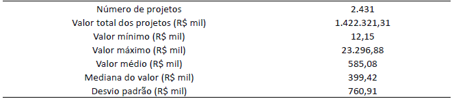 A tabela 1 apresenta algumas estatísticas descritivas sobre o programa de P&D ANEEL. O número total foi de 2,4 mil projetos cujo valor total acumulado entre 2000 e 2009 alcançou R$ 1,42 bilhões. O valor dos projetos exibe grande dispersão, uma vez que o valor máximo foi de R$ 23 milhões e o mínimo de apenas R$ 12 mil (POMPERMAYER et al. 2011).