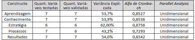 Foi utilizado o coeficiente Alfa de Cronbach, que é a estatística mais utilizada para se verificar a coerência interna de um conjunto de itens, determinando a confiabilidade de uma medida. Hair et al. (2009) sugerem que, para a computação desse coeficiente, deve-se assumir que: 1) as práticas já formam um conjunto unidimensional e 2) as práticas têm iguais confiabilidades. Quanto mais alto for o valor do Alfa, que varia de 0 a 1, maior é a consistência interna da medida. Para estudos exploratórios, sugerem-se valores acima de 0,60 e, para pesquisas confirmatórias, acima de 0,70 (HAIR et al., 2009). O conjunto de fatores extraídos da variância explicada é maior que 30% em todas as dimensões, o que é muito positivo, em se tratando de pesquisa social em que a informação é frequentemente menos precisa (HAIR et al., 2009).